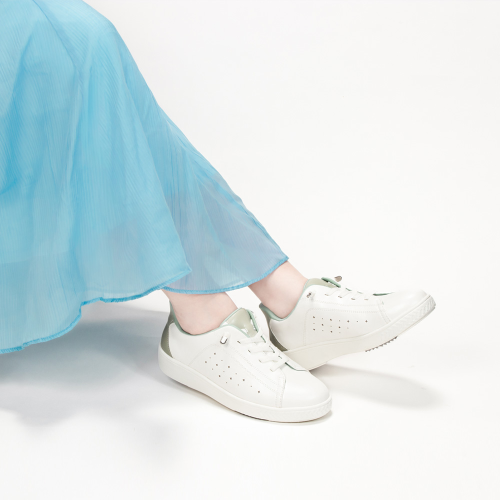 清楚で落ち着いた色合いとシンプルベーシックなスタイルで、何にでも合わせやすく日常使いできるコンフォートスニーカー。パンチングはさりげなく星型で、ほんのりとした可愛らしさも魅力。艶のあるアッパーが高級感を演出します。