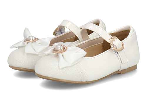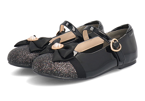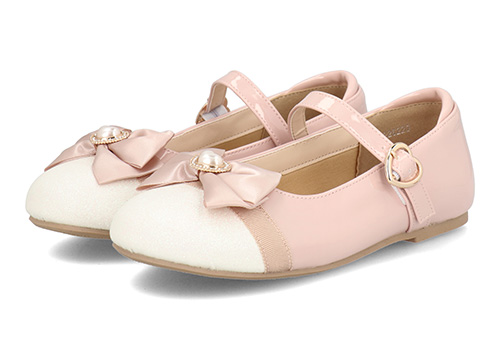 キラキラと輝くアイドルのようなスタイルで、ラメやリボン、ハートなど愛らしいあしらいが詰まった一足。華やかなビ印象はそのままに、ローヒールにやわらかなアッパーとふんわりクッションでお子さまの足を包み込むので、慣れないフォーマルでも安心です。