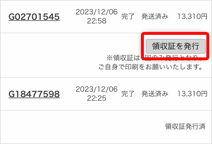領収証発行は商品の発送完了後にマイページの「ご注文履歴」に「領収証を発行」ボタンが表示されたご注文についてのみ、発行(印刷)が可能となります。