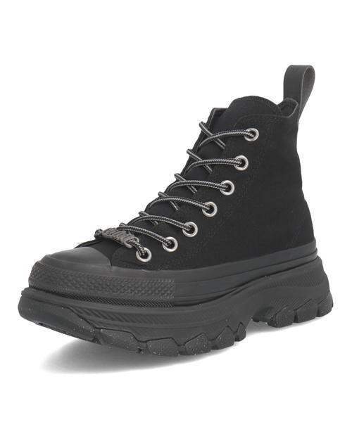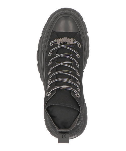 トレッキングシューズをモチーフに、ボリュームソールを合体させたALL STAR R TREKWAVE HIをベースに、ブラックモノクロームでカラーリングし、ブーツライクに仕上げた1足。