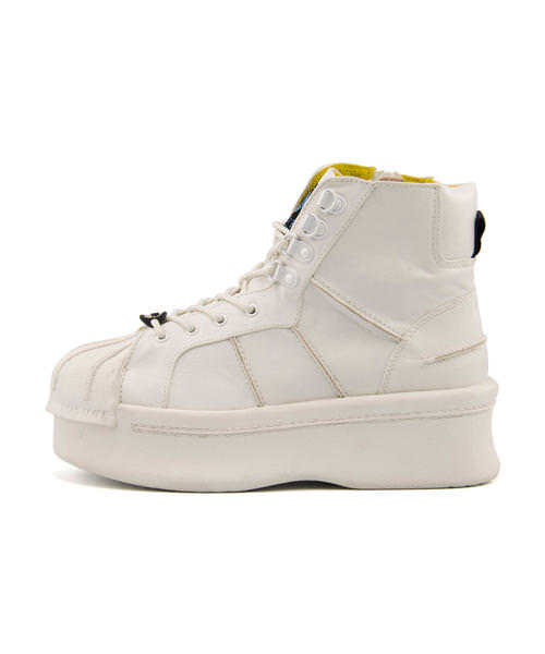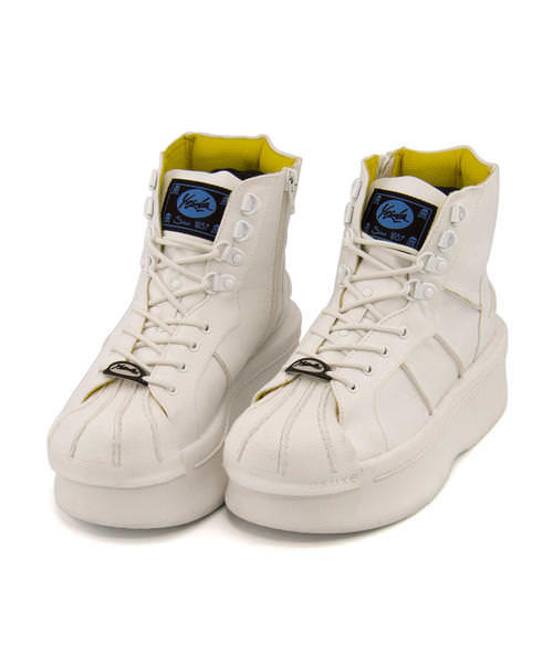 個性派ブランドYOSUKEで大人気のプラットフォームスニーカー☆ 圧倒的な存在感を放つボリューミーなハイソールに、Dリングがスポーティな雰囲気をプラス☆ ハイカットのレースアップデザインながら、サイドジップで脱ぎ履きもスムーズ♪ 厚底ならではの弾力のある履き心地と、スタイルアップ効果も魅力です♪ またヒール傾斜がなく、フラット感覚でラクに履けちゃうのもうれしい♪ 履き口には厚みのあるクッションを入れた、足にも優しい仕様です☆ ストリートはもちろん、ライブでも目を惹くアイテム!モノトーンカラーに、レトロな花柄と、それぞれ表情の違うカラーバリエーションで、選ぶのも楽しい1足です☆●サイズ換算目安:S(22-22.5cm)・M(23-23.5cm)・L(24-24.5cm)・LL(25cm)※展開サイズ:レディース
