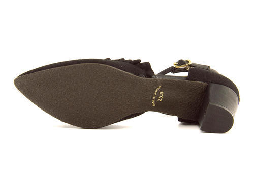 サイドオープンの肌見せで、さりげない女性らしさを演出するストラップパンプス。ポインテッドトゥに配したフリルの組み合わせが、大人可愛い仕上がりに。アンクルストラップが足首をホールドし、安定感のある歩行をサポートします。インソールにはクッションを使用し、足あたりも柔らか。太めのヒールで歩きやすく、デイリーからセレモニーなどのオケージョンシーンにも活躍します!※展開サイズ:レディース