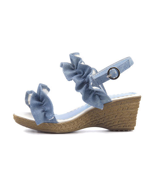 立体的なフリルがとてもキュートなキッズサンダル☆ 女の子らしさをMAX高めるガーリーなデザインが、季節感たっぷりな可愛らしい足元へと仕上げてくれます☆ バックストラップは裏ゴム付きなので、脱ぎ履き楽チン♪ インソールには、ソフトなクッションをセットし、履き心地の良さもポイントです☆ またウェッジソールでヒールアップしたちょっぴり大人っぽい表情も、オシャレ大好きガールには高ポイント☆ つま先に厚みを待たせ、ヒール傾斜を軽減した厚底デザインは、安定感とさりげない脚長効果も期待できそうです♪ 普段使いにもお出かけにも、沢山使えるキュートな一足☆※展開サイズ:キッズ